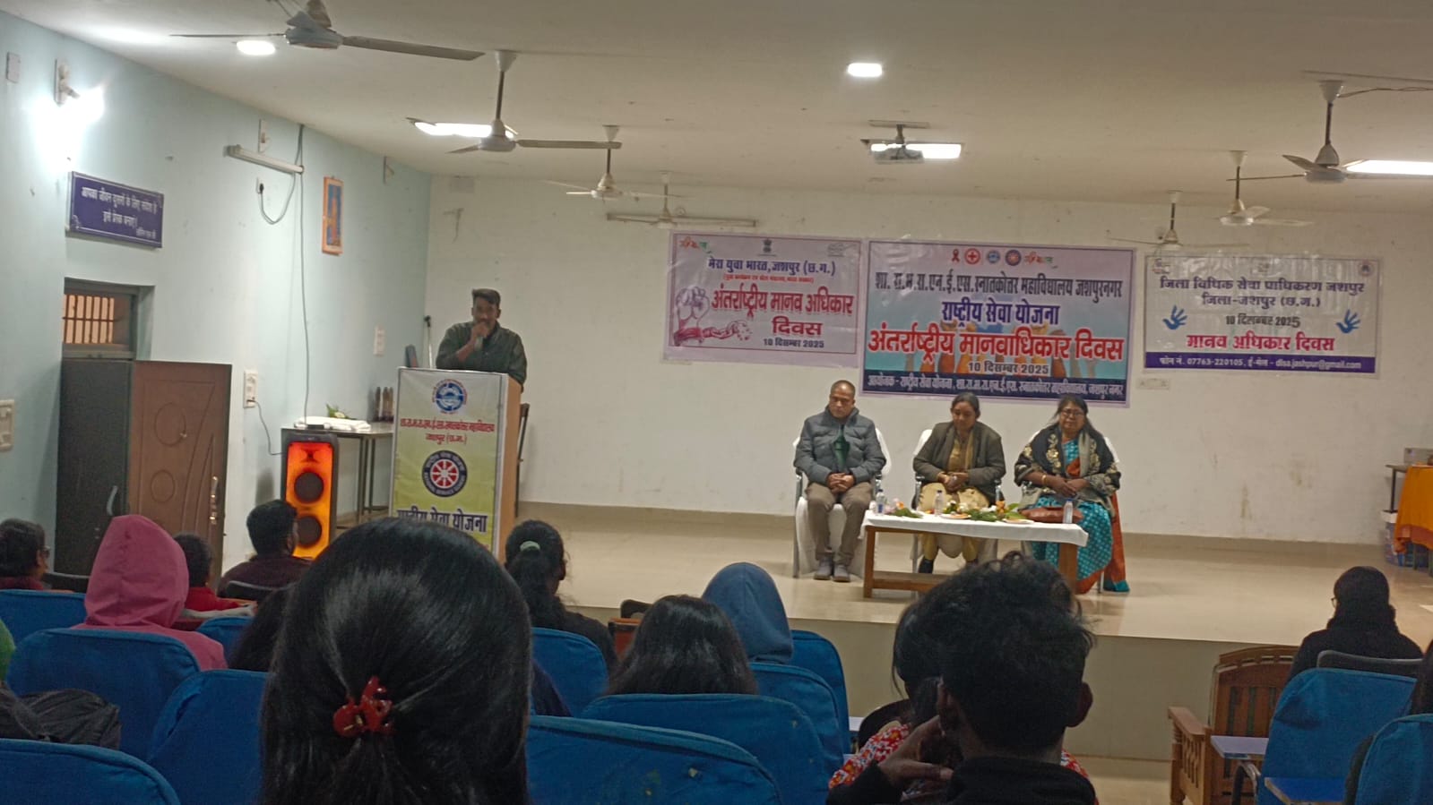 जशपुर 10 दिसंबर 2025 : शासकीय राम भजन राय एन.ई.एस. स्नातकोत्तर महाविद्यालय, जशपुरनगर में राष्ट्रीय सेवा योजना के संगठन व्यवस्था के अंतर्गत महाविद्यालय के प्राचार्य डॉ. अमरेंद्र के मार्गदर्शन एवं रासेयो कार्यक्रम अधिकारी गौतम कुमार सूर्यवंशी के नेतृत्व में मानवाधिकार दिवस उत्साहपूर्वक मनाया गया।