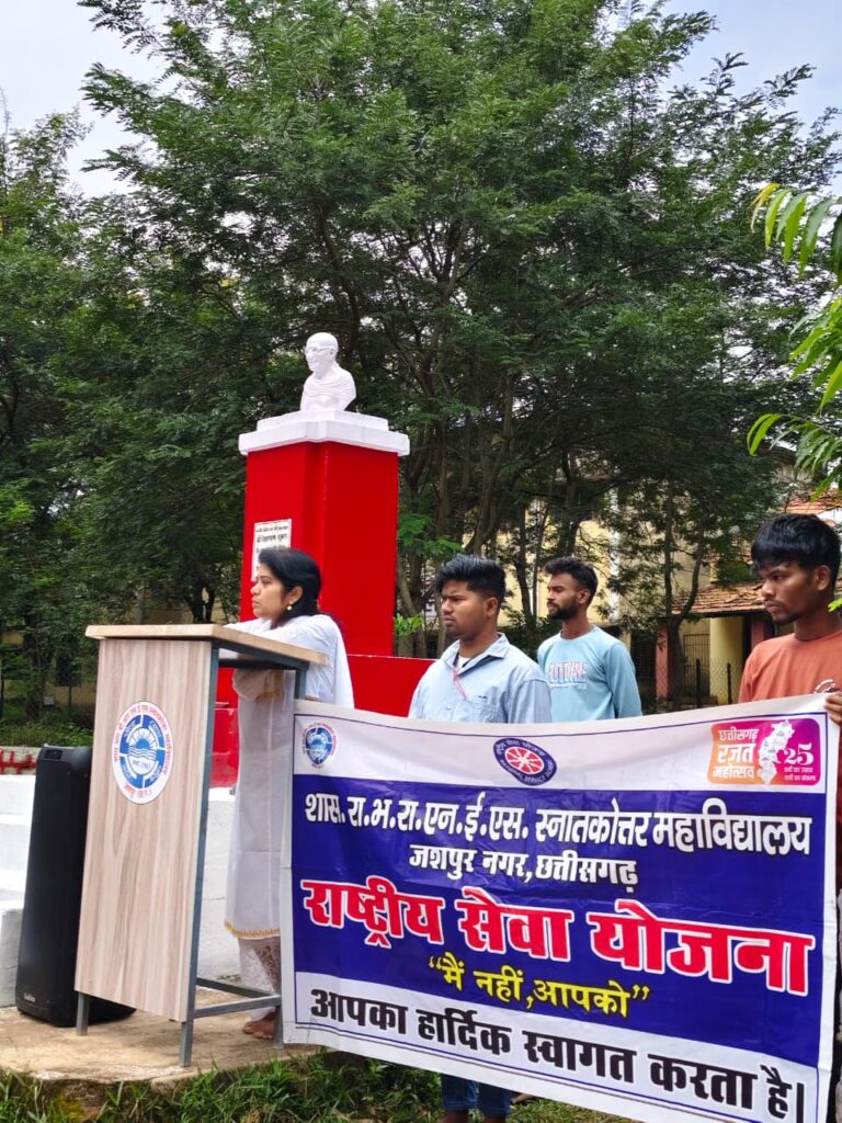 जशपुर /शहर के अग्रणी महाविद्यालय शासकीय राम भजन राय एन.ई.एस. स्नातकोत्तर महाविद्यालय, जशपुरनगर में आज गांधी जयंती एवं सेवा पखवाड़ा 2025 महाविद्यालय के प्राचार्य डॉ. अमरेंद्र के मार्गदर्शन में हर्षोल्लास एवं गरिमामय वातावरण में सम्पन्न हुआ।
