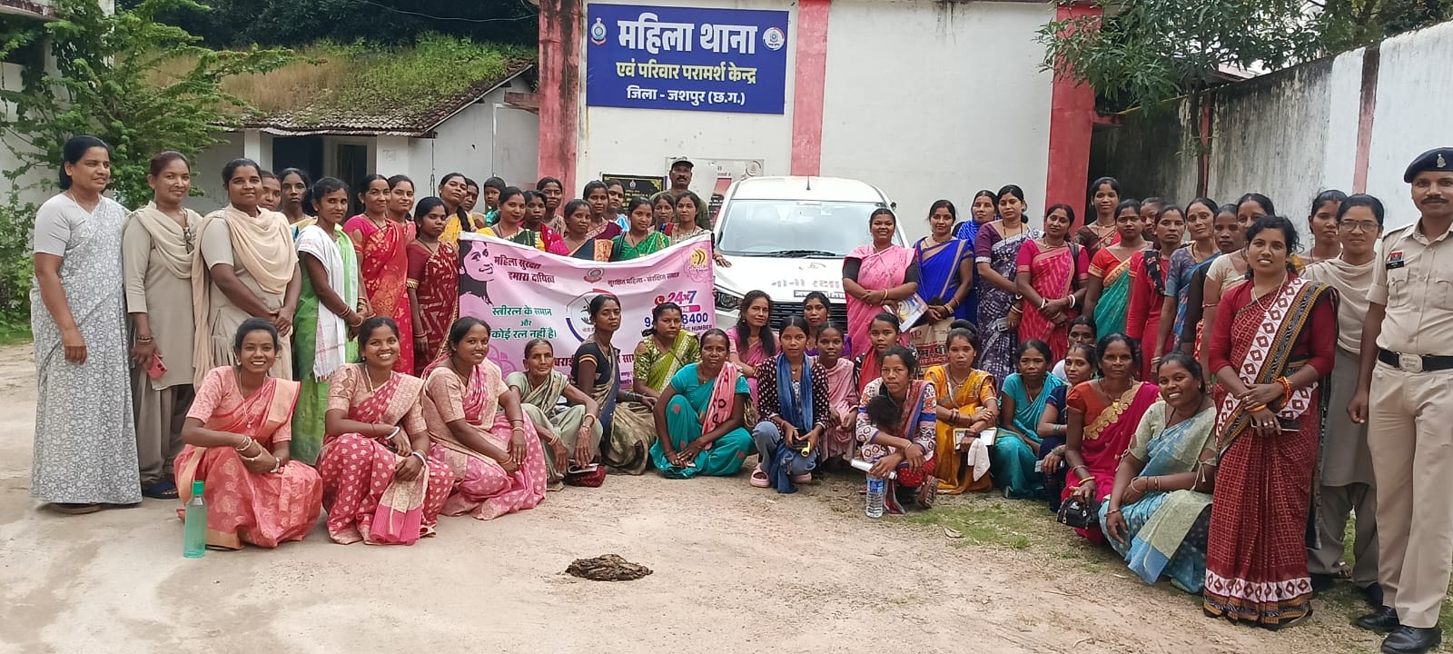जशपुर पुलिस द्वारा महिला थाना परिसर में चलाया गया जागरूकता अभियान, महिलाओं को सायबर फ्राॅड, महिला/बालिका के विरूद्ध होने वाले अपराधों की बारीकियों और नोनी रक्षा रथ की कार्यप्रणाली से अवगत कराया,