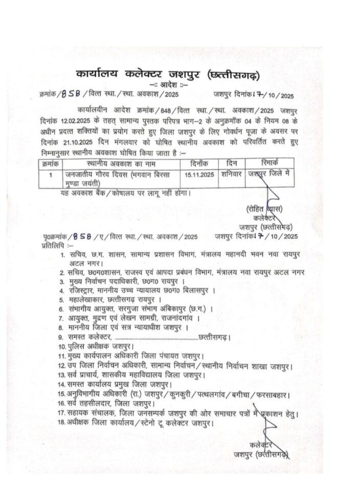 जशपुर नगर /18 अक्टुबर 2025। कलेक्टर कार्यालय जशपुर ने एक महत्वपूर्ण आदेश जारी करते हुए जिले के लिए घोषित स्थानीय अवकाश की तिथि में परिवर्तन किया है। पहले गोवर्धन पूजा के अवसर पर घोषित अवकाश को अब बिरसा मुंडा की जयंती पर मनाए जाने वाले ‘जनजातीय गौरव दिवस’ पर स्थानांतरित कर दिया गया है।