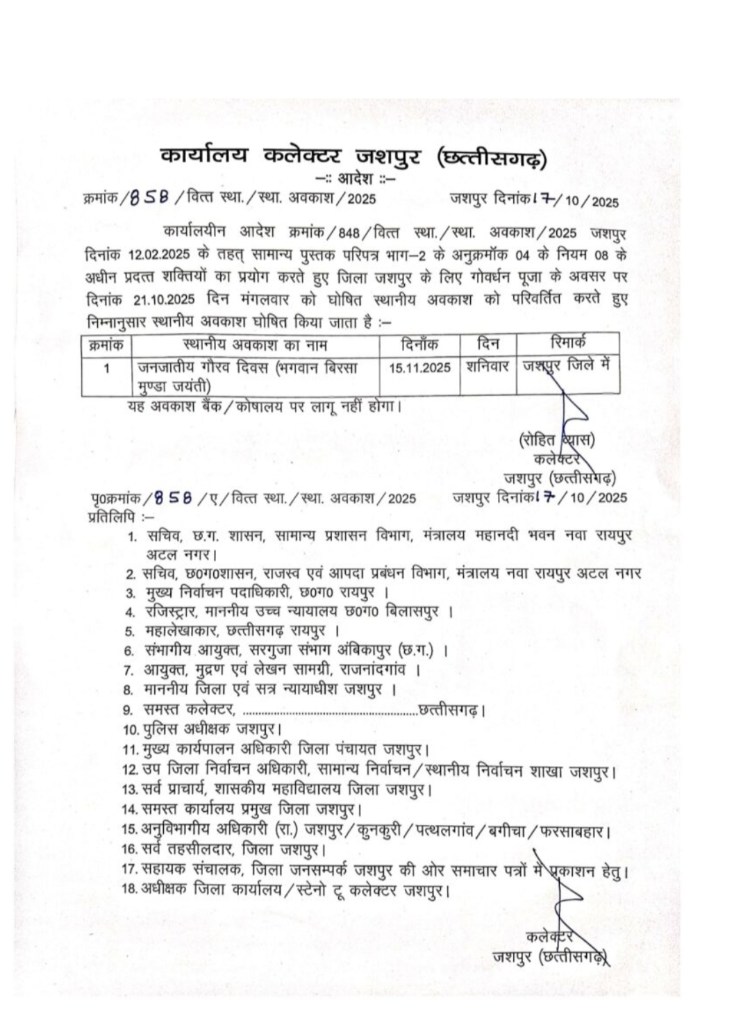 कलेक्टर जशपुर (छत्तीसगढ़) के आदेश क्रमांक 858/वित्त/स्था.अवा./2025 दिनांक 7/10/2025 के अनुसार, कार्यालयीन आदेश क्रमांक 848 के तहत प्रदत्त शक्तियों का प्रयोग करते हुए यह परिवर्तन किया गया है।