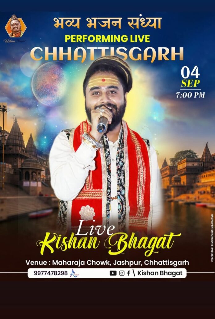 जशपुर, छत्तीसगढ़,4 सितंबर: भजन प्रेमियों के लिए आज की शाम बेहद खास होने वाली है। मध्य प्रदेश के इंदौर से आए प्रसिद्ध भजन गायक किशन भगत आज रात 8 बजे शहर के महाराजा चौक में अपनी प्रस्तुति देंगे।