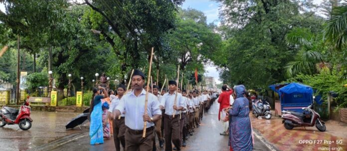 बरसात में भी उमड़ा संघ का उत्साह, निकला विजयदशमी पथ संचलन